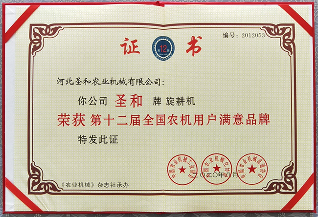 圣和旋耕機榮獲第十二屆滿意品牌證書