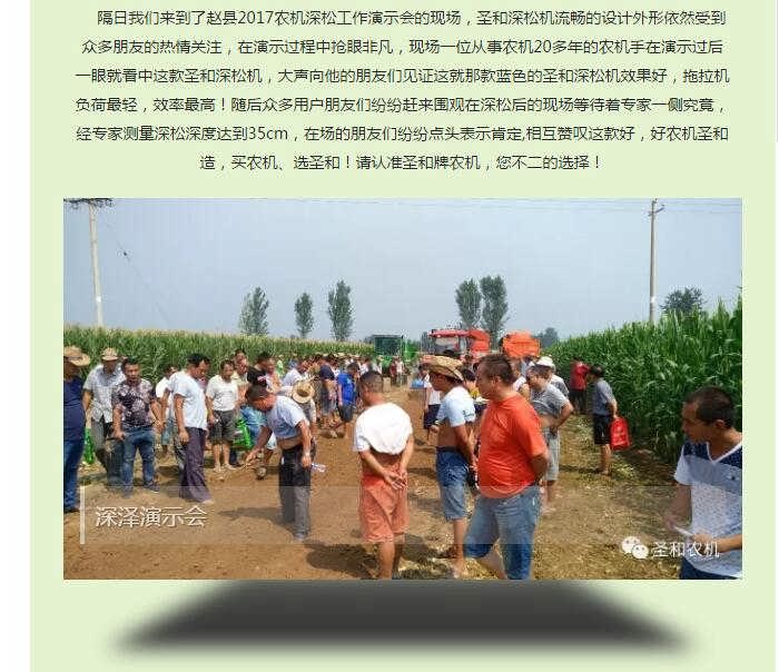 經(jīng)過輾轉(zhuǎn)我們又來到了深澤2017年秋季深松演示會的現(xiàn)場為您帶來一線現(xiàn)場的深松、耕整盛況:多家玉米收獲機演示過后,觀眾為接下來的耕整機械吊足了胃口,圣和1SS-270型深松機閃亮登場,氣質(zhì)不凡的“小伙兒”蓄勢待發(fā),一口氣卯足了勁,三加五除二的快速深松過去,現(xiàn)場觀眾還沒來得及過足癮就完成任務(wù)!此前多位農(nóng)民朋友就已經(jīng)有意選購如此如意產(chǎn)品,都在等待這場令人矚目和期待的演示會,看到如此演示效果,笑容變得更加燦爛,紛紛表示再來一圈!經(jīng)過大伙的測量深松深度達到了將近38cm左右!在隨后普勞恩德(河北)農(nóng)業(yè)機械有限公司生產(chǎn)的普勞恩德PLAUERN旋耕機受到朋友們的高度關(guān)注,它采用德國技術(shù),實現(xiàn)了旋耕機質(zhì)的飛躍---采用流線型設(shè)計,零部件靜電等離子噴涂,整機流水線組裝,加工時依靠工裝、模具保證零部件的尺寸精度(側(cè)板沖壓成型、一次沖孔;刀軸焊后加工;主梁焊后加工),從而保證了整機裝配精度;上蓋板為圓弧活蓋式,使刀軸回轉(zhuǎn)上腔體空間加大,作業(yè)中甩起的泥土不易粘結(jié),同時有利于維修保養(yǎng);采用加重型刀庫,精密鑄造成型;采用日本進口刀片,持久耐用。廠內(nèi)安裝刀片,交付用戶以后,不用再為刀片錯裝而煩惱。變速箱逐臺進行磨合試驗,刀軸旋轉(zhuǎn)靈活,旋耕機作業(yè)時可節(jié)省8~10馬力。刀軸采用機器人焊接,雙層迷宮槽式防塵罩,有效保護軸承不受惡劣作業(yè)環(huán)境的影響,延長了使用壽命。加寬后托板,確保達到最佳平地效果。防磨板采用加寬、加大結(jié)構(gòu),可根據(jù)地域要求選擇配裝。側(cè)板兩側(cè)可選裝切草刀,斬斷、分離工作中堆積的草團。整機覆膜、木箱包裝,既保護了整機外觀的亮麗如新,又節(jié)省了運輸、儲存空間。真是買不知道,不用不知道,此次演示會獲得了眾多農(nóng)機合作社和老機手的充分肯定,圣和農(nóng)機以真實的用戶體驗,完美的演示效果讓在場的每個人都心悅誠服。