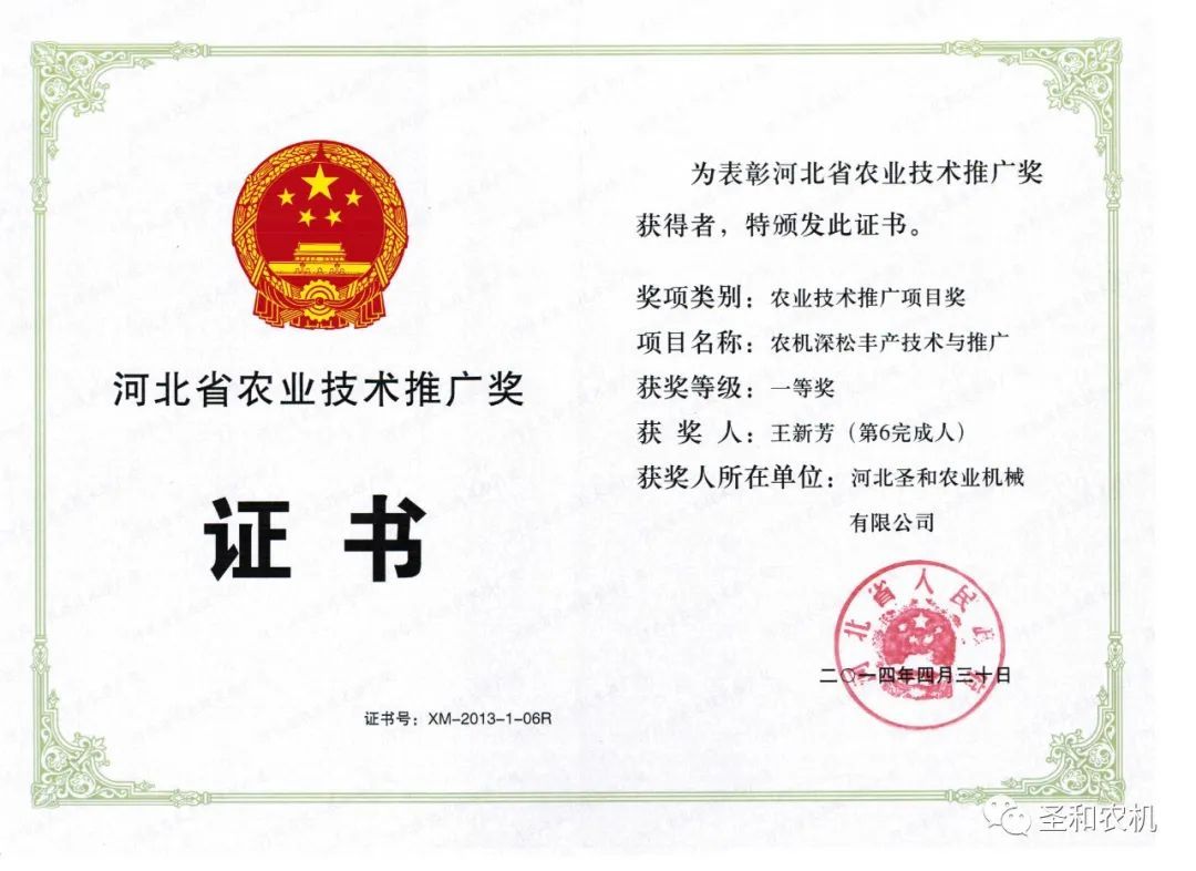 ●2016年,圣和公司研發(fā)中心被邢臺(tái)市科技局認(rèn)定為“邢臺(tái)市大田耕種機(jī)械工程技術(shù)研發(fā)中心”。